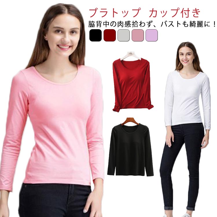 Tシャツとして着れる 柔らかもっちり パット付長袖Tシャツ ラウンドネック アンダーフリー ゴムなし ブラトップ 8分袖 9分袖 ロンT