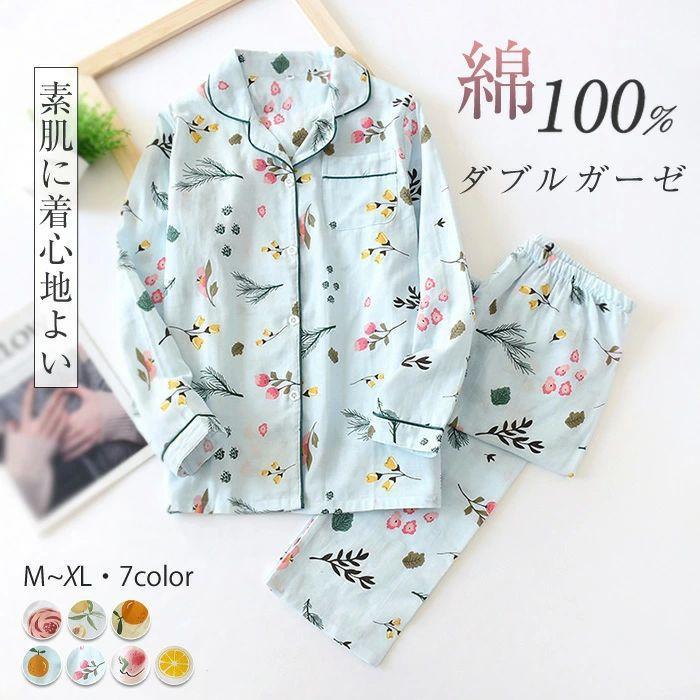ガーゼ パジャマ レディース ルームウェア 長袖 部屋着 セットアップ 2点セット 寝間着 春 秋 寝巻き 上下セット 前開き 快適 大きいサイズ 綿100% コ 2重ガーゼ