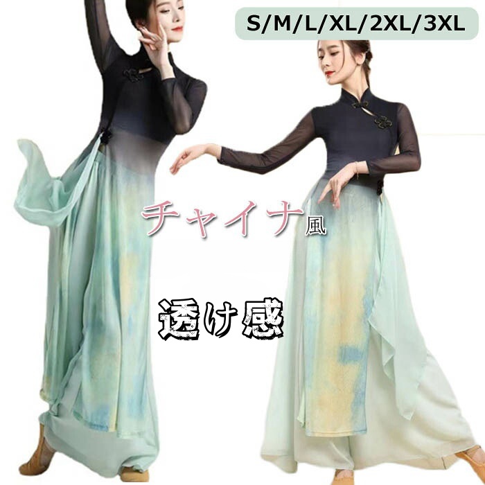 ダンス衣装 チャイナ風 3点セット レディース 大きいサイズ グラデーション 古典舞踊 シフォン キッズ 舞台服 団体服 古典ダンス 長袖 中華風 中華ダンス シフォン ダンスウエア 透け感 ふわふわ 薄手 ワイドパンツ ステージ衣装 大人可愛い 動きやすい