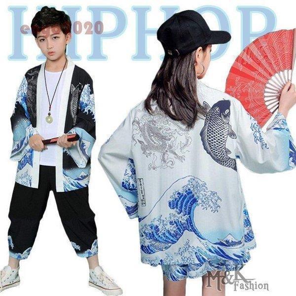 キッズ ダンス衣装 セットアップ 3点セット 韓国 ヒップホップ 花柄 シャツ 鯉 お祭り衣装 コスチューム 男の子 女の子 和装 和風 発表会 演出 団体服 羽織り