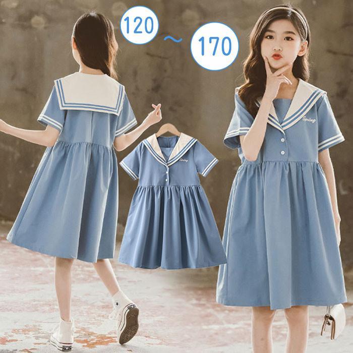 キッズ ワンピース セーラーワンピース マリン セーラー服 ギャザー プリーツ 子供ドレス 通園 通学 夏物 中学生 修学旅行 半袖 ジュニア