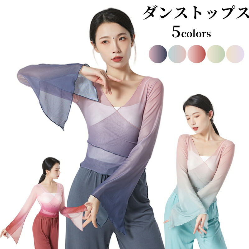 古典ダンストップス 2点セット フリル グラデーションシフォン ボディライン ステージ用 スリットベル袖 女性用 透け感トップス レディースダンスウェア 長袖 ダンスブラウス