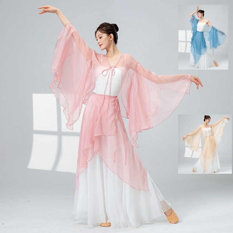 古典ダンストップス 2点セット フリル 蝶飾り グラデーションシフォン ボディライン ステージ用 スリットベル袖 女性用 透け感トップス レディースダンスウェア ダンスブラウス ダンス練習服 ダ 長袖