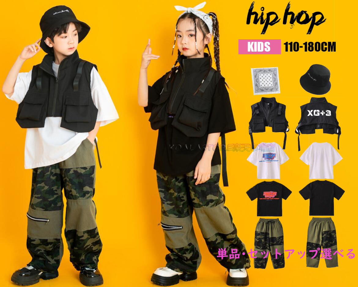 子供ダンス衣装 女の子 男の子 ジャズダンス衣装 迷彩パンツ 子供服 タンクトップ カーゴパンツ カーゴベスト 帽子 単品 セット選択可 HIPHOP JAZZ衣装 スト キッズヒップホップダンス衣装
