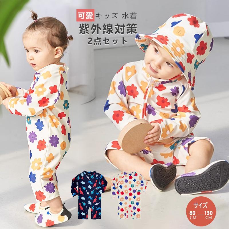 キッズ 水着 男の子 女の子 ベビー水着 2点セット キャップ付き 子供水着 オールインワン スクール水着 UVカット ラッシュガード 紫外線対策 日焼け 長袖
