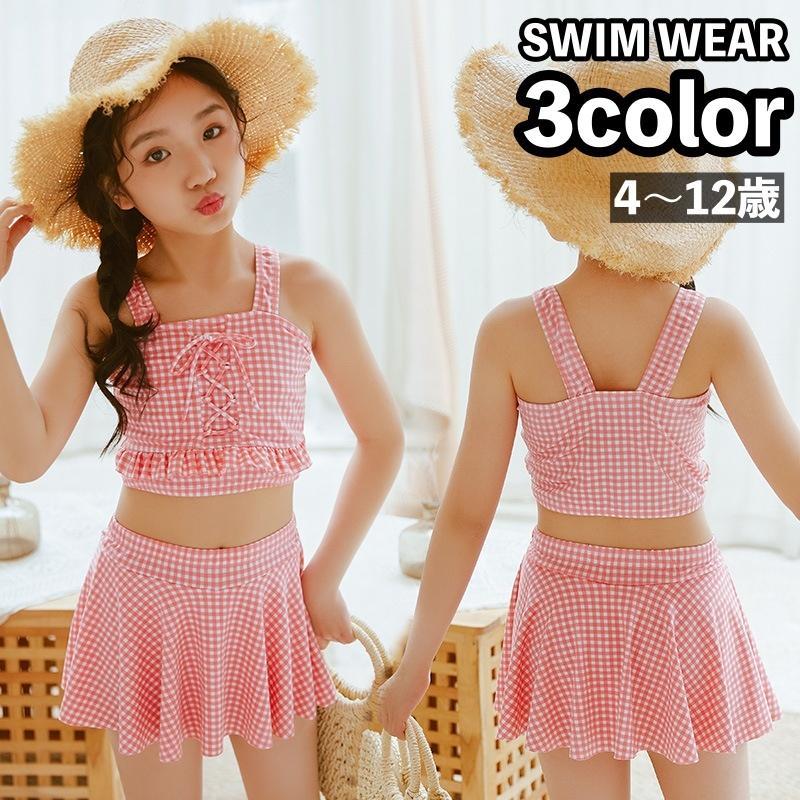 水着 タンキニ セパレート 2点セット 子供用 キッズ ジュニア 女の子 スイムウェア スカート ギンガムチェク リボン 可愛い おしゃれ ガ フリル