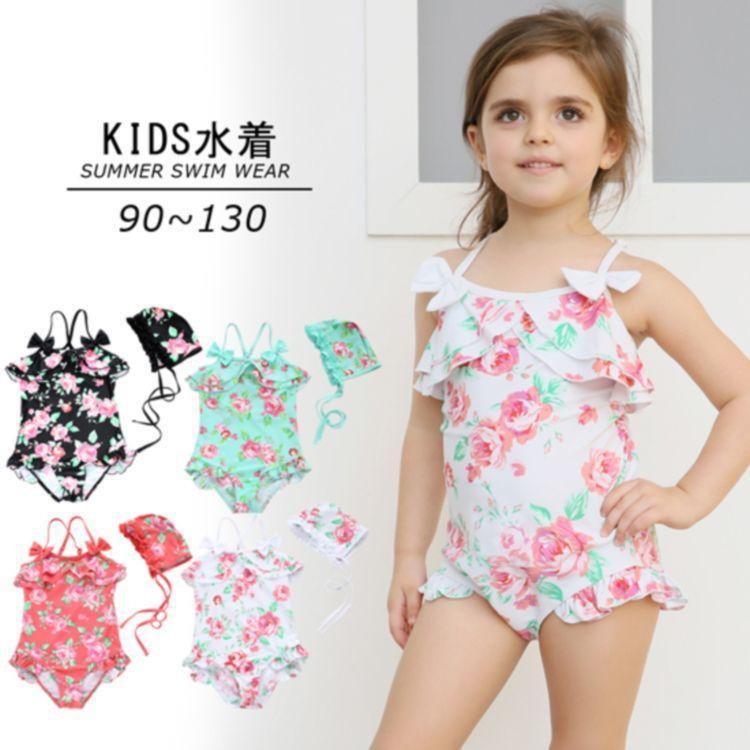 キッズ水着 水着 キャミソールワンピース キャップ付き 花柄 フラワー 可愛い リボン フリル レース装飾 プール 女の子 サイズ豊富 キッズ 海