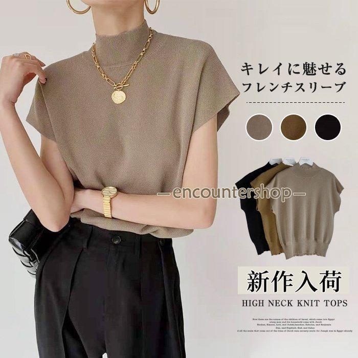 ニット レディース フレンチスリーブ 半袖 プチハイネック 無地 トップス コーデ 春夏秋 二の腕カバー フラッタースリーブ
