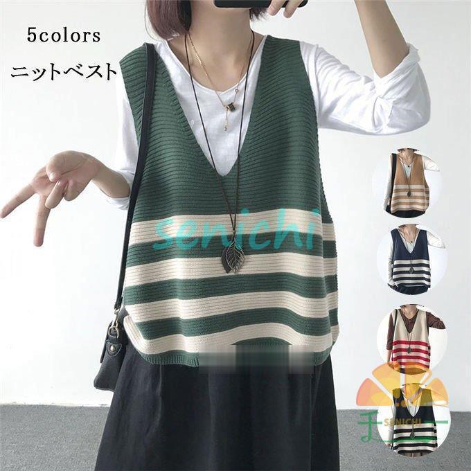 ベスト ニットベスト レディース ノースリーブ Vネック セーター ボーダー柄 プルオーバー ゆったり 大きいサイズ おしゃれ 秋 新作 着痩せ